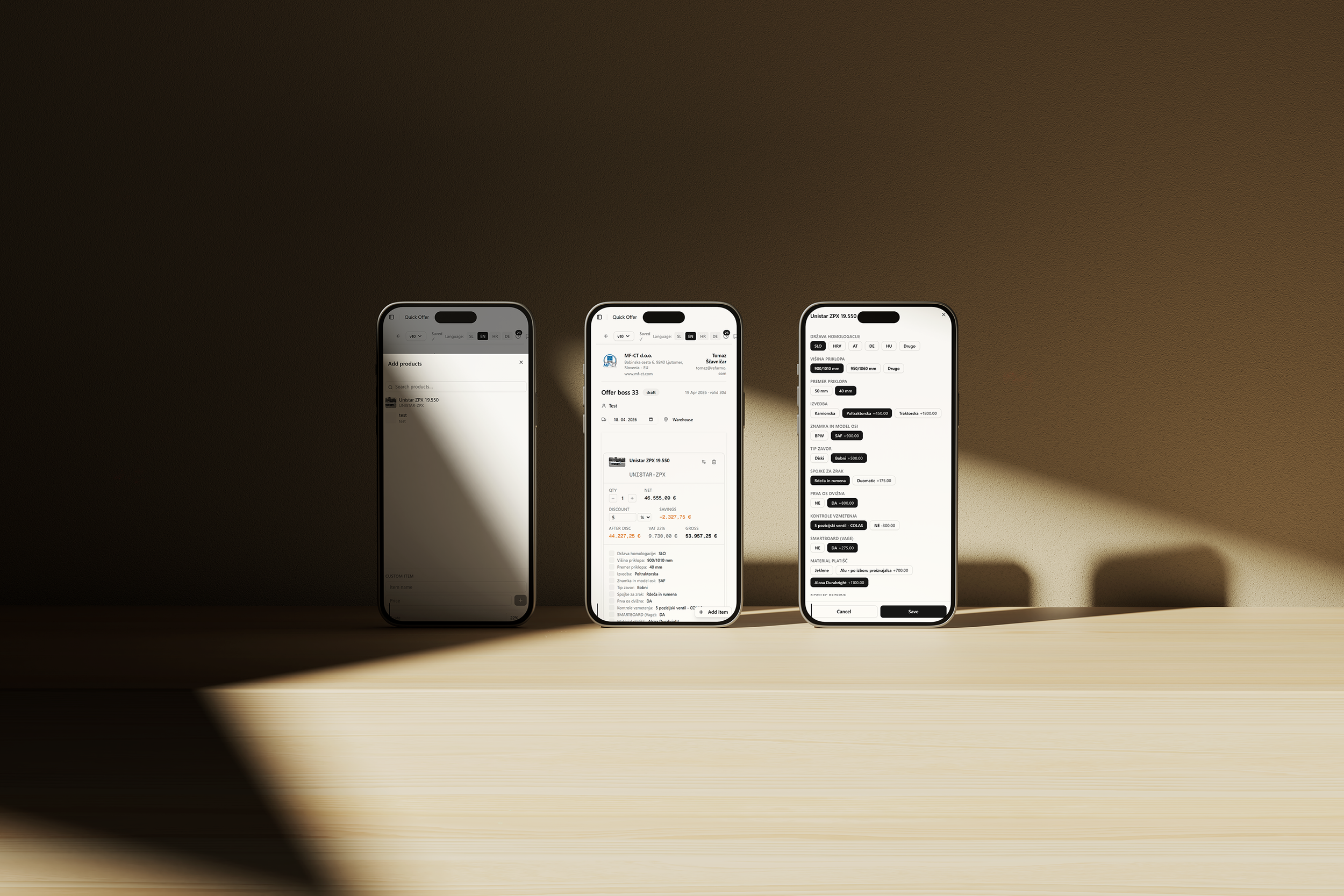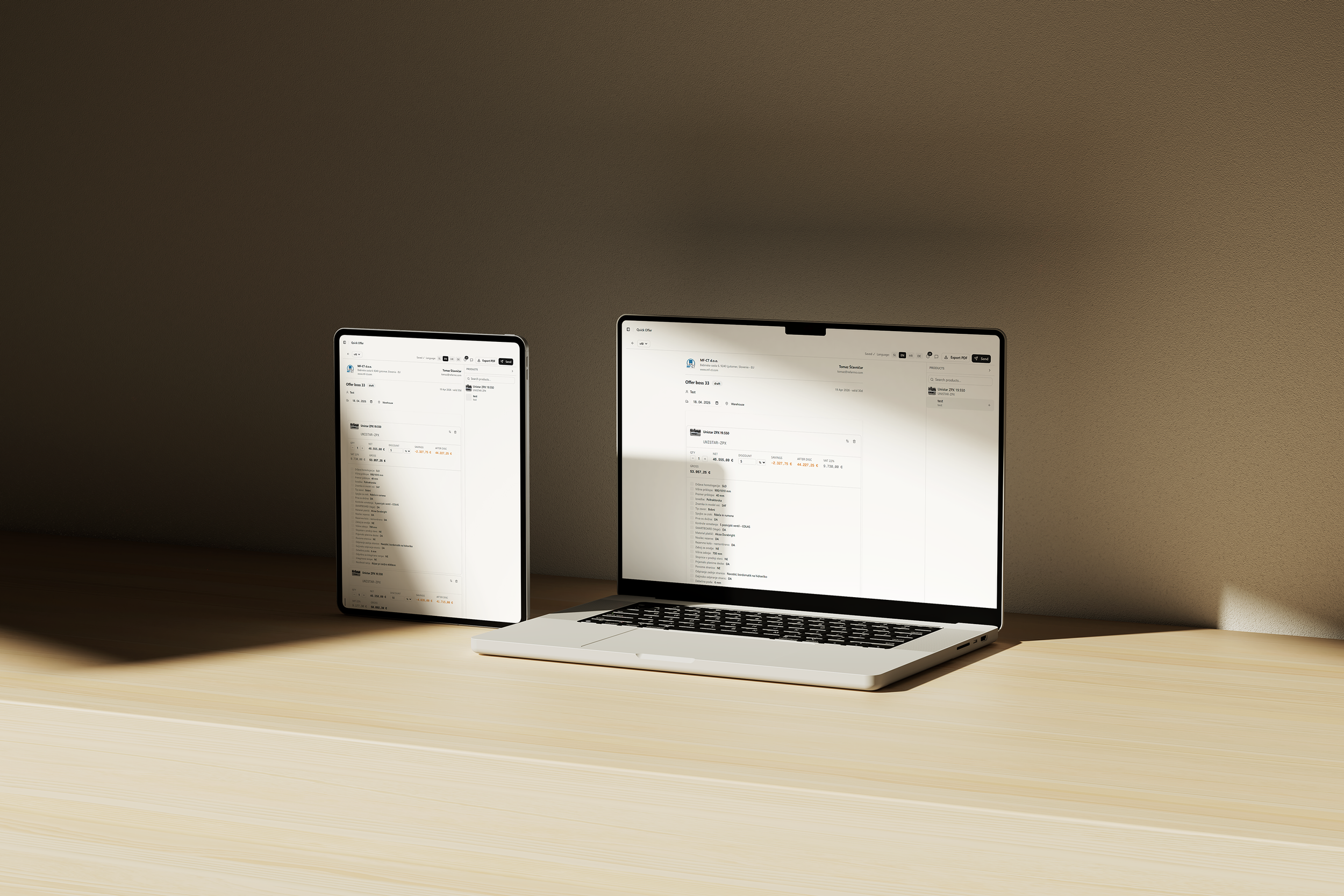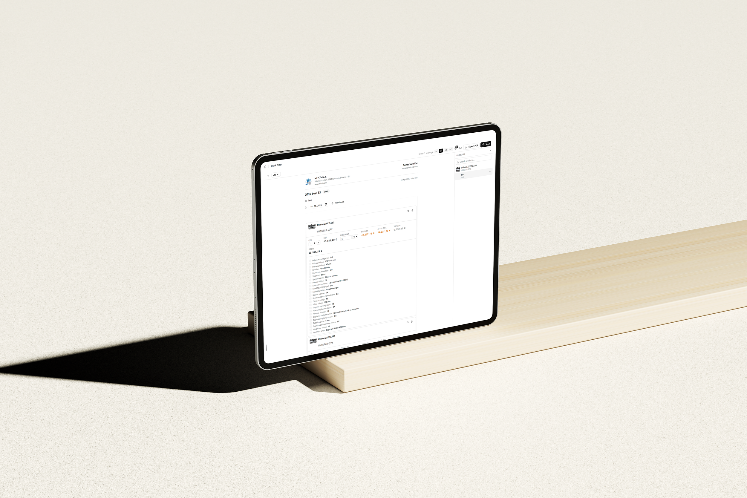 Offer Boss is a web app where you set up a product catalog and create offers, invite sales reps to access the app and build offers online in minutes. Using our powerful offer builder you pick products from catalog, configure options, hit send. That's it. No Excel. No back-and-forth with the office. Just a clean offer in the client's inbox while your competitor is still formatting a PDF.